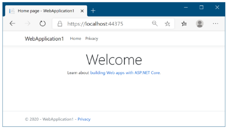 По умолчанию на странице отображается приветствие и ссылка на документацию по ASP.NET Core. В верхней части страницы две ссылки — Home (мы сейчас здесь) и Privacy. Щелкнув по Privacy, попадем на новую страницу. Обратите внимание — на обоих страницах заголовок со ссылками одинаковый.