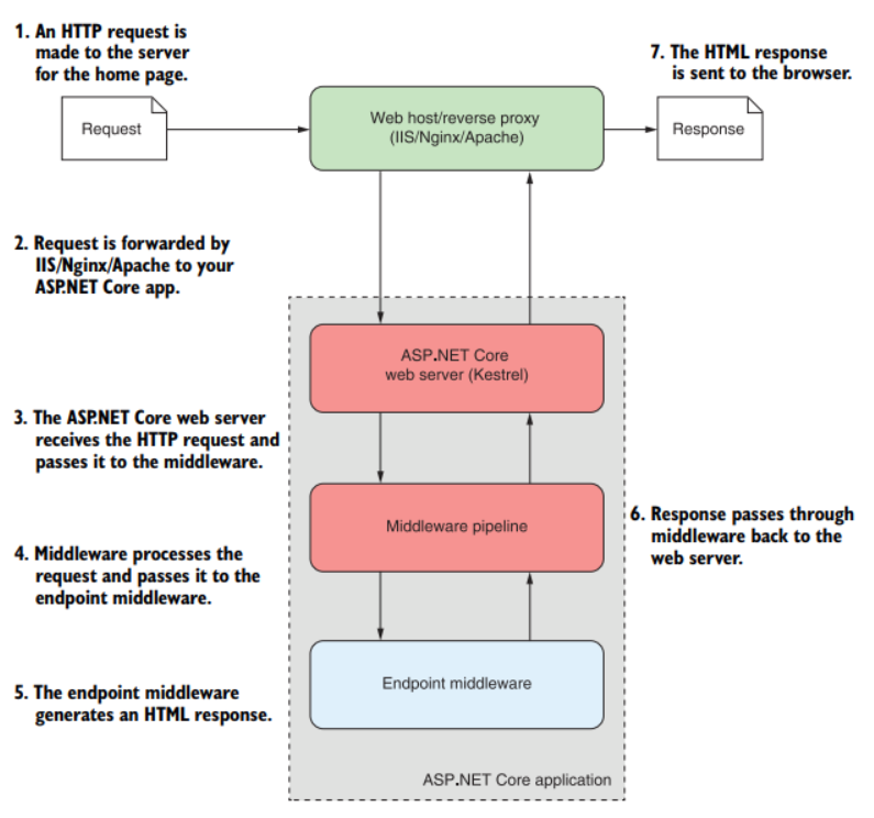Приложение ASP.NET Core состоит из: веб-сервера (обычно это Kestrel), конвейера промежуточного ПО (middleware) и компонента конечной точки (endpoint).