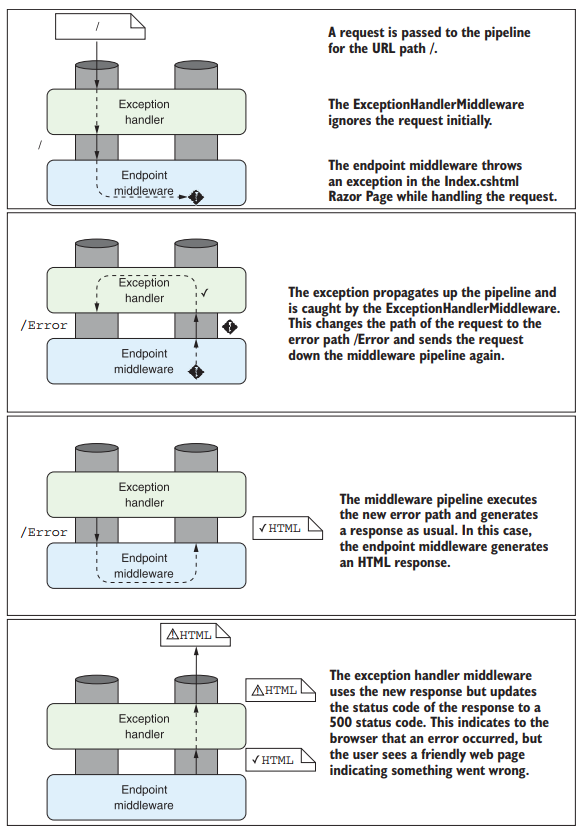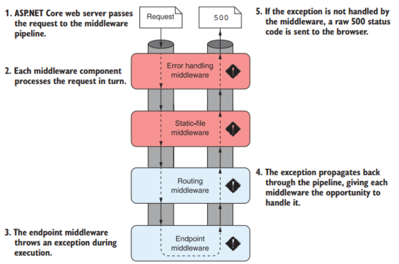 Если исключение возникает в компоненте конвейера, оно распространяется вверх по конвейеру. Если конвейер не обработает исключение, веб-сервер вернет пользователю код ошибки 500.