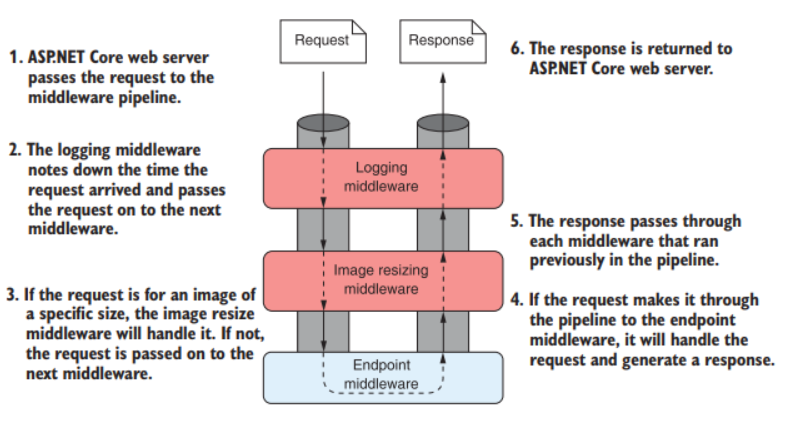 - обработать исходящий HTTP-ответ, изменить его и передать либо другой части промежуточного ПО, либо веб-серверу ASP.NET Core.