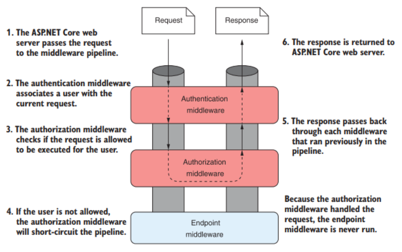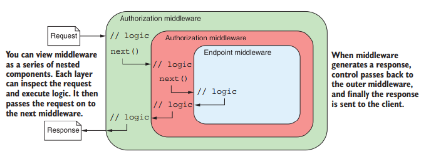 Например, компонент аутентификации связывает запрос с пользователем, а компонент авторизации проверяет, имеет ли данный пользователь полномочия на выполнение данного запроса, и если имеет — передает запрос компоненту конечной точки для генерации ответа. В противном же случае — генерирует ответ с ошибкой, не давая запросу достигнуть конечной точки.