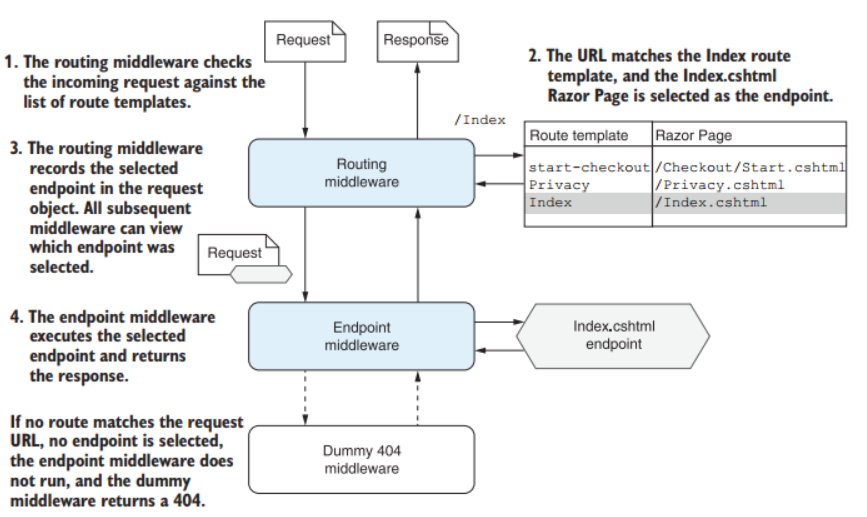 Если RoutingMiddleware не находит подходящий запросу шаблон, конечная точка не выбирается, запрос передается дальше по конвейеру. EndpointMiddleware игнорирует такой запрос, и, если компонентов после EndpointMiddleware нет, выполняется фиктивный компонент и возвращается ответ 404 Not Found.
