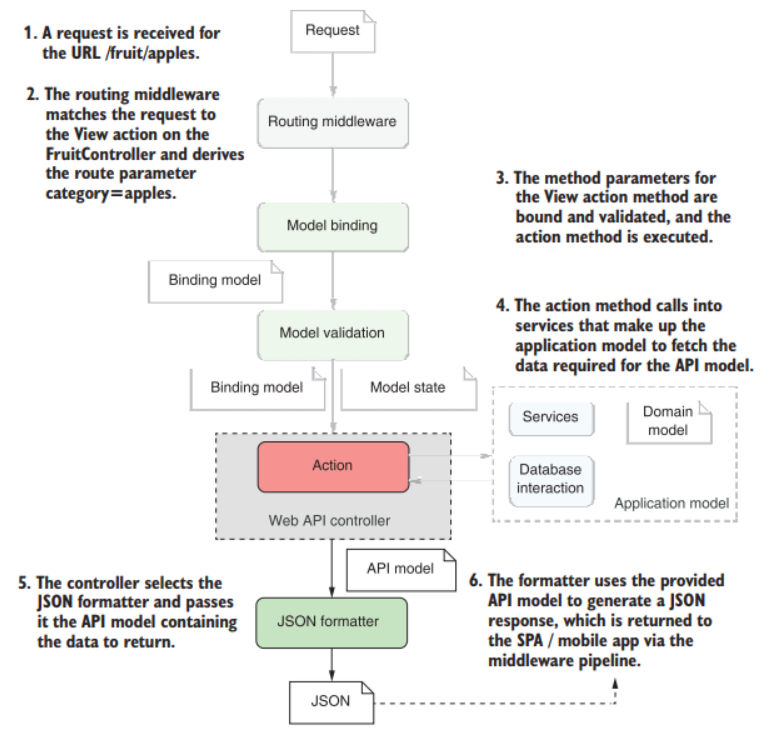 Компонент маршрутизации выбирает конечную точку для вызова на основе входящего URL-адреса, для API это контроллер и действие. Далее происходит привязка модели, при которой создается и заполняется значениями из запроса модель привязки. При этом веб-API используют форматтеры ввода, чтобы принимать данные в различных форматах.1 Валидация проходит аналогичным с Razor Pages образом, свойство ModelState в базовом классе ControllerBase заполняется ошибками валидации.
