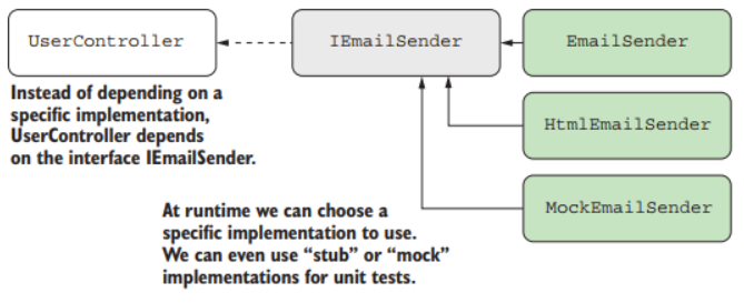 Использование EmailSender в качестве параметра конструктора уменьшило связанность системы, однако, чтобы снизить ее еще больше (а также сделать UseController тестируемым), необходимо привязываться не к реализации, а к интерфейсу — это поможет отвязаться от конкретной реализации (и заменять их при необходимости).