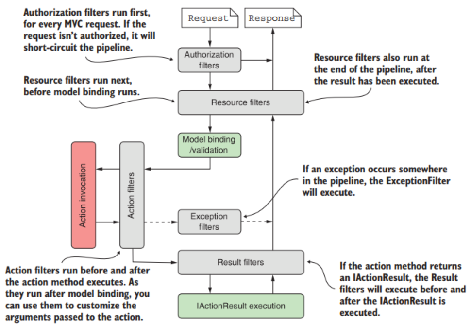 - фильтры авторизации — запускаются первыми в конвейере. Если фильтр авторизации считает, что запрос неавторизован, он завершит запрос, предотвращая выполнение остальной части конвейера;