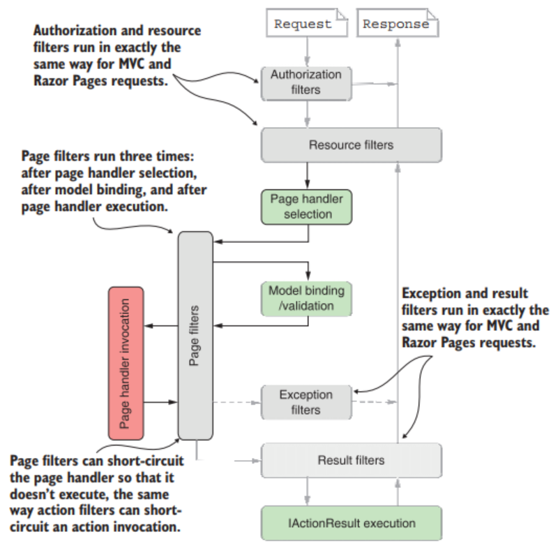 Razor Pages использует ту же базовую архитектуру, что и контроллеры API, поэтому его конвейер фильтров практически идентичен. Схему см. на рисунке: