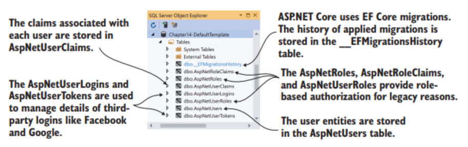 - AspNetUserRoles, AspNetRoles и AspNetRoleClaims — для совместимости со старой моделью полномочий на основе ролей.