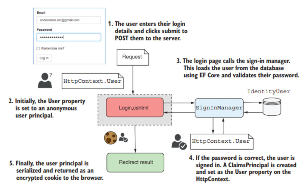 Когда запрос только поступает, Kestrel создает анонимного принципала и назначает его свойству HttpContext.User. Затем запрос маршрутизируется на страницу Login.cshtml, которая считывает адрес электронной почты и пароль из запроса, используя привязку модели.