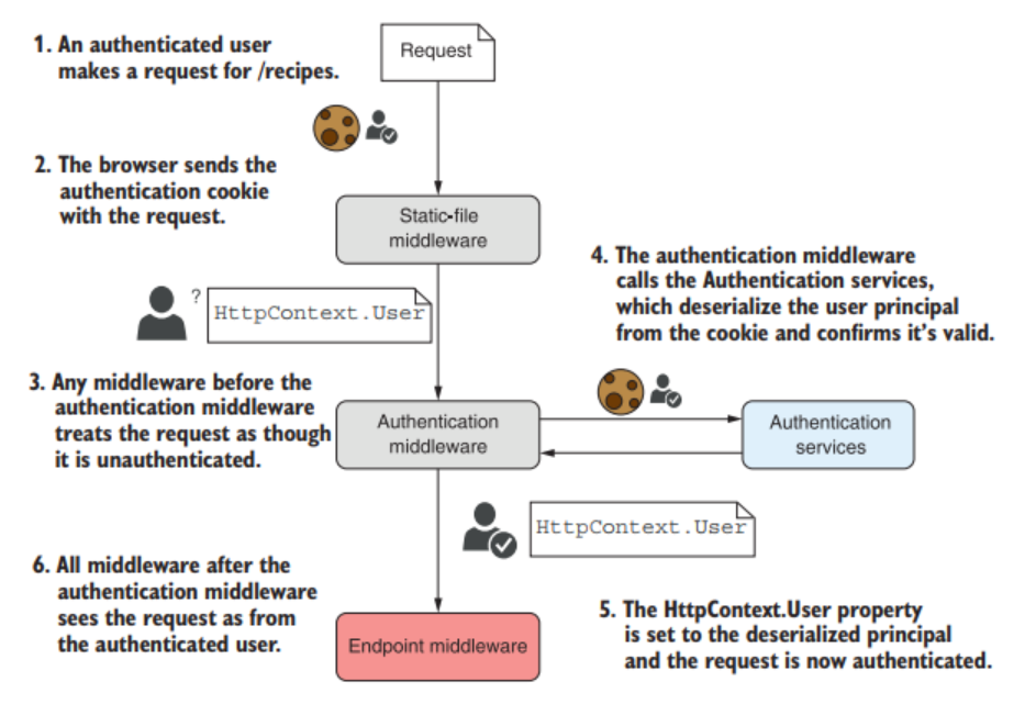 AuthenticationMiddleware вызывает сервис аутентификации, который считывает cookie из запроса, расшифровывает его и десериализует, чтобы получить ClaimPrincipal. AuthenticationMiddleware задает проверенного принципала в HttpContext.User.