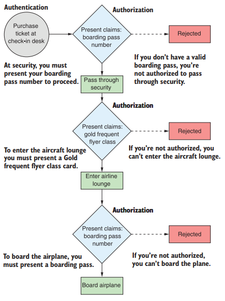 Можно сравнить процесс аутентификации и авторизации с процессом проверки в аэропорту. Вот он на картинке: