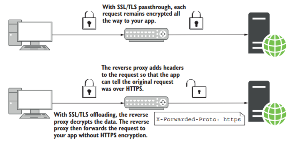 В зависимости от конкретной инфраструктуры, SSL/TSL-терминирование можно перенести на выделенное устройство в сети, сторонний сервис (например, CLoudflare) или обратный прокси-сервер, работающий на одной машине с приложением, или на отдельной машине.