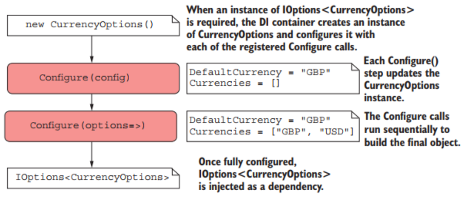 Configure<T>() добавляет еще шаг конфигурации к объекту CurrencyOptions. Когда контейнеру внедрения зависимостей требуется экземпляр IOptions<CurrencyOptions>, каждый из шагов выполняется по очереди.