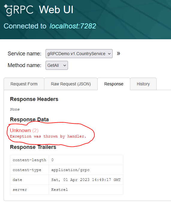 GetAll из gRPCUi получим ошибку сервера со статусом Unknown.