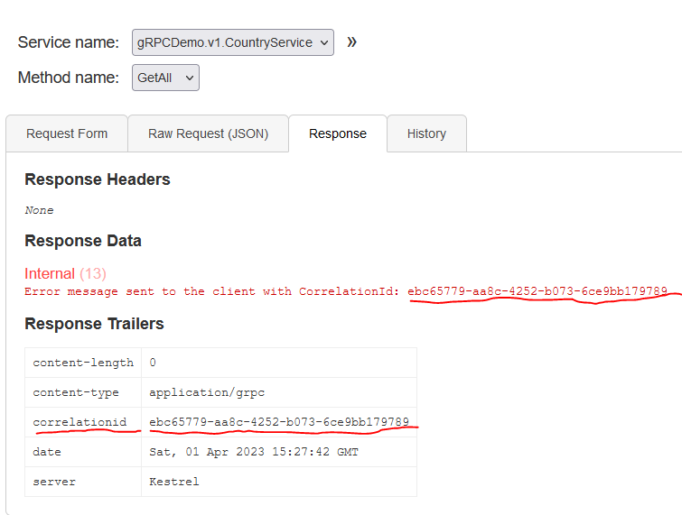 Далее, было бы желательно, чтобы статус был более информативным, нежели UNKNOWN. Для этого обернём код метода в try/catch, и в catch-блоке выбросим исключение RpcException, которое сможет вернуть осмысленный код статуса. Также добавим в трейлеры ответа уникальную строку correlationId: по этому уникальному ключу можно связать ошибку, возникшую на клиенте, с конкретной ошибкой на сервере. Заодно добавим логгер1, который залогирует исходную ошибку и correlationId.