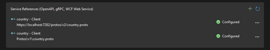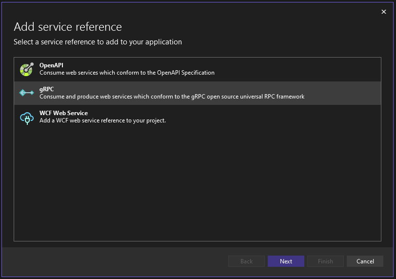 На клиентской стороне можно не размещать файлы самостоятельно. Есть специальный диалог для добавления. Щёлкаем на проекте правой кнопкой, затем Add > Service Reference… и в открывшемся окошке выбираем gRPC