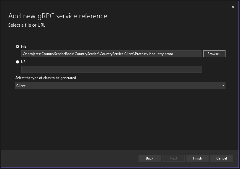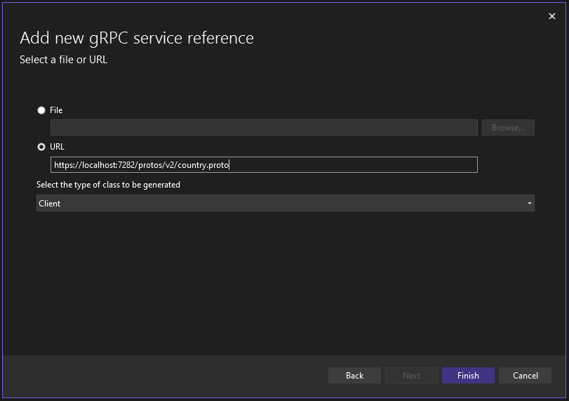Далее есть два варианта. Для версии 1 выбираем File и находим нужный файл (я заранее скопировал его в папку Protos в клиентском проекте).