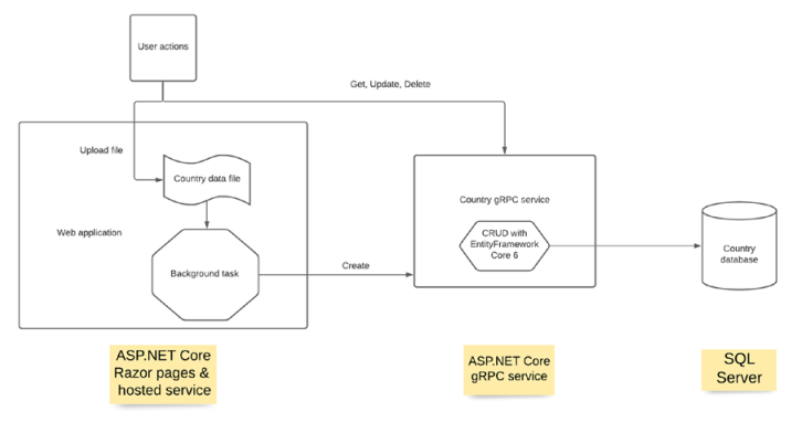 В этой главе мы создадим полноценное, хоть и простое приложение. Представьте вики, к примеру вики стран, которое будет использовать ASP.NET Core Razor Pages для веб-интерфейса, фоновый сервис с gRPC в качестве API, позволяющий перемещать данные между БД и веб-интерфейсом, SQL Server для хранения данных, и EF Core для доступа к ним.