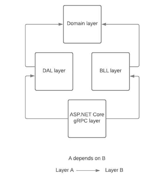 CountryService.gRPC— проект сервисов gRPC;CountryService.DAL— проект с кодом доступа к данным (DAL, data access layer );CountryService.BLL— проект с бизнес-логикой (BLL, business logic layer);CountryService.Domain— проект с доменными объектами, используемыми по всему приложению