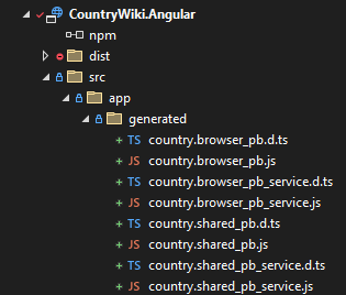Для нашего проекта мы будем использовать те же самые .proto-файлы, которые сделали в главе 11. Добавим в наш Angular проект папку protos/v1 и скопируем туда файлы country.browser.proto и country.shared.proto. Также нам нужно будет заранее создать папку под сгенерированные файлы, разместим её внутри проекта, в src/app/generated. Далее перейдем в папку src и выполним команду: