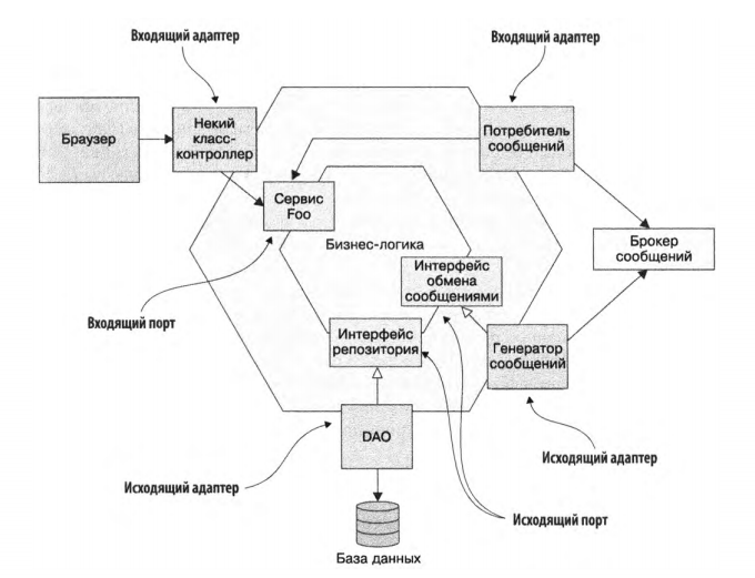 Исходящий адаптер реализует исходящий порт и обрабатывает запросы бизнес-логики, обращаясь к внешнему приложению или сервису. Например — класс объекта доступа к данным(Data Access object — DAO). Еще пример — класс-прокси, вызывающий внешний сервис. Еще пример — клиент брокера сообщений, публикующий сообщения.