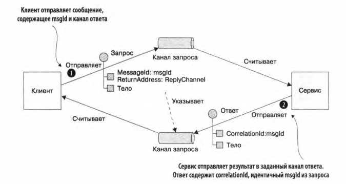 Чтобы реализовать стиль взаимодействия, клиент и сервис обмениваются парными сообщениями через каналы типа “точка-точка” (см. рисунок). Сначала клиент отправляет в канал сервиса команду с указанием операции и ее параметров, а также идентификатором запроса и каналом ответа в заголовке. Сервис обрабатывает команду и записывает свой ответ в указанный канал с указанием идентификатора соответствия равного идентификатору запроса. Клиент использует идентификатор соответствия, чтобы сопоставить ответ с запросом.