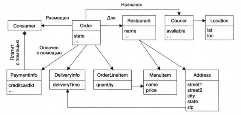 Этот пример содержит несколько классов, соотносящихся с бизнес-объектами: Consumer, Order, Restaurant и Courier. Как видно, в модели не хватает чётких границ между разными бизнес-объектами. Например, не видно, какие классы входят в бизнес-объект Order.