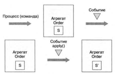 Чтобы обработать запрос и обновить агрегат, бизнес-логика вызывает командный метод из его корня. В традиционном подходе такой метод проверяет свои аргументы и обновляет одно или несколько полей агрегата. При порождении событий командные методы должны генерировать события. Результатом вызова командного метода агрегата является последовательность событий, описывающих изменения, которые нужно применить к агрегату, чтобы перевести его в новое состояние.