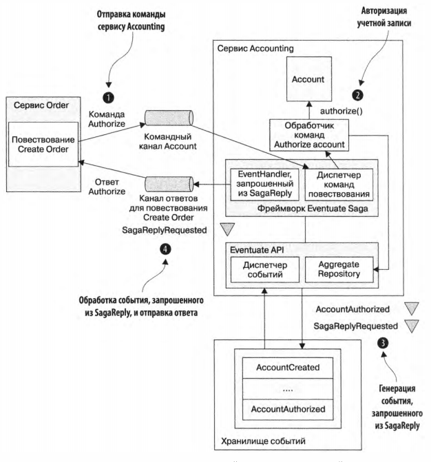 SagaReplyRequestedотправляет ответ в канал ответов оркестратора, используя данные псевдособытия.