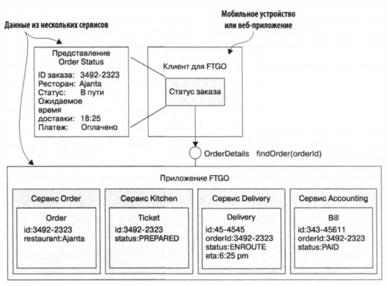 2. API-шлюз, реализующий внешний API приложения. Этот вариант подходит, если операция запроса входит в состав внешнего API. Вместо перенаправления запросов к другому сервису шлюз реализует логику объединения API.