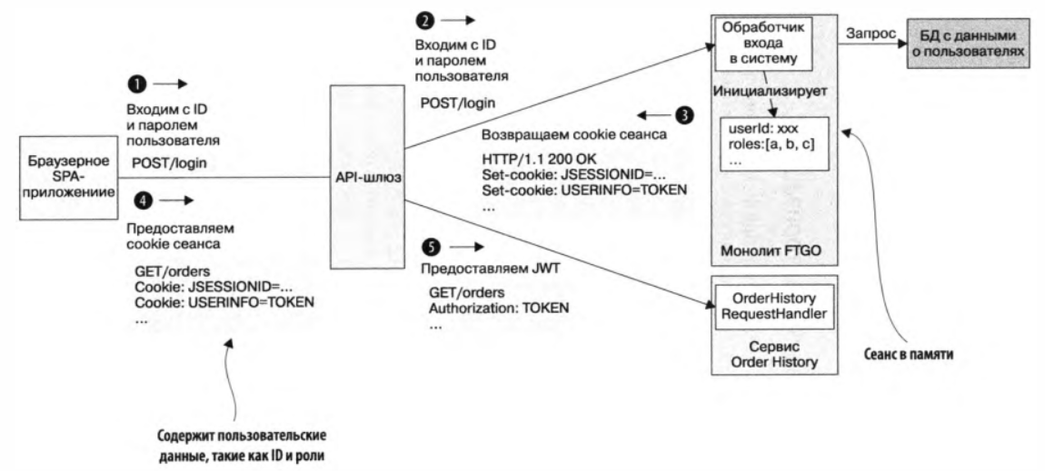 Обработчик входа в систему возвращает дополнительный cookie (в примере USERINFO). Он содержит информацию о пользователе, такую как его ID и роли. Браузер включает этот cookie в каждый запрос. API-шлюз извлекает содержимое cookie и добавляет его в HTTP-запрос к сервису.