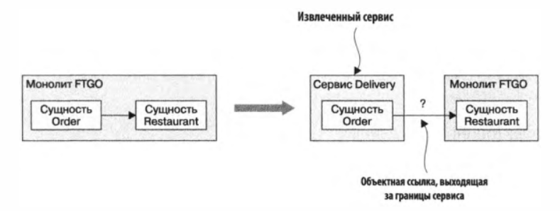 Чтобы извлечь сервис, необходимо вычленить его доменную модель из доменной модели монолита. Одна из проблем здесь состоит в устранении объектных ссылок, которые могу выйти за границы сервиса.