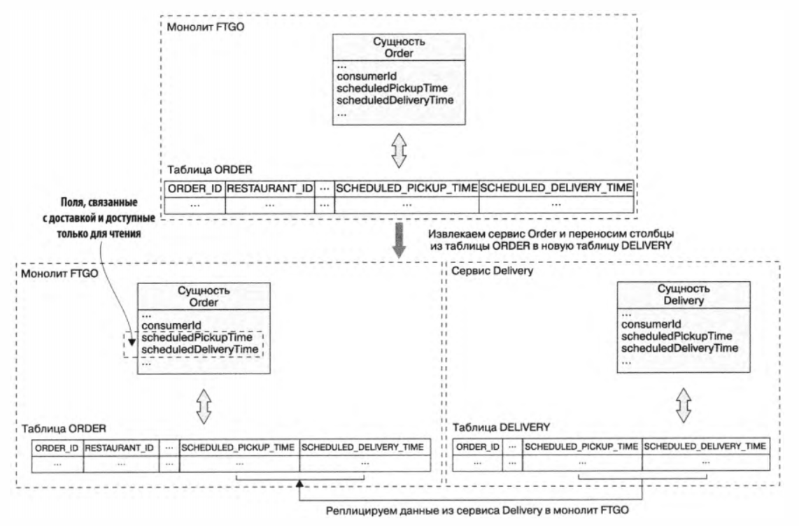 Многие классы хранят свои данные на постоянной основе. Следовательно, вместе с сервисом из монолита извлекаются и данные. Кроме того, при разделении сущности нужно разделить соответствующую таблицу в БД и переместить ее часть в сервис.