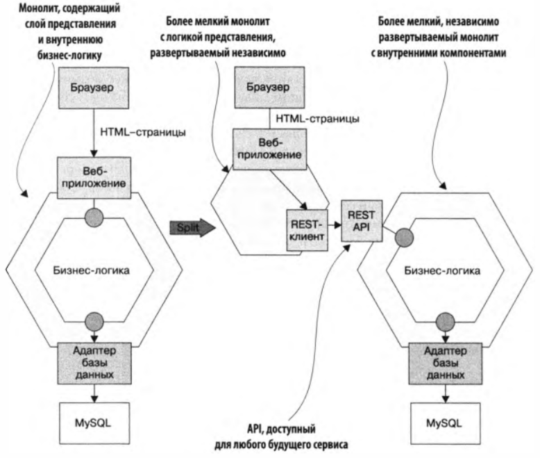 Бизнес логика обычно обладает обобщенным API с одним или несколькими фасадами, которые ее инкапсулируют. Этот API представляет собой естественный шов,вдоль которого монолит можно разделить на два более мелких приложения.