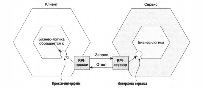 Клиентская бизнес-логика обращается к прокси-интерфейсу, реализованному классом-адаптером RPI-прокси. RPI-прокси выполняет запрос к сервису. Запрос обрабатывается классом-адаптером RPI-сервер, который вызывает бизнес-логику сервиса через интерфейс. Затем ответ передается обратно в RPI-прокси, который возвращает результат клиентской бизнес-логике.