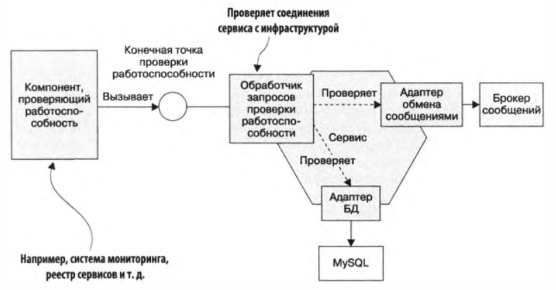 Код, реализующий конечную точку для проверки работоспособности должен каким-то образом определять состояние экземпляра сервиса. Например, получить соединение с БД и выполнить тестовый запрос (либо выполняет более сложную тестовую логику). Также можно добавить проверку соединения с брокером сообщений.