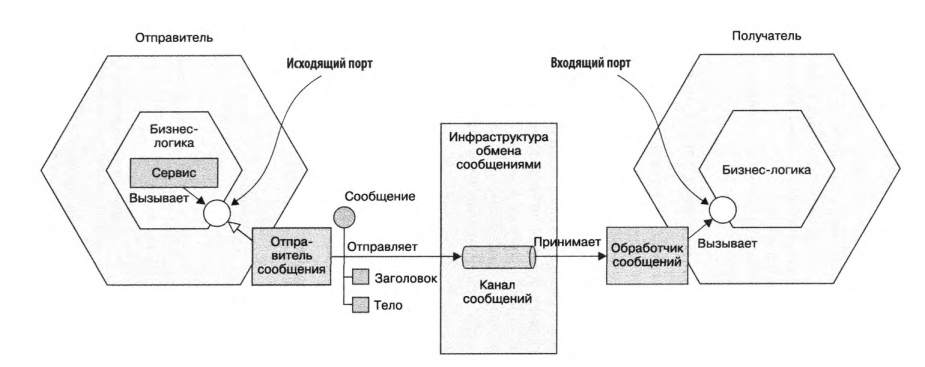 Сообщения передаются по каналам. Бизнес-логика отправителя обращается к исходящему порту, реализованному классом отправителя, который отправляет сообщение через канал. Канал сообщений — инфраструктурная абстракция. Для обработки сообщения класс-адаптер обработчика сообщений, который обращается к интерфейсу входящего порта, реализованному бизнес-логикой получателя.