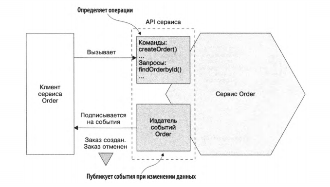 Рассмотрим пример. Сервис обладает API, который инкапсулирует его реализацию. API определяет операции, вызываемые клиентами. Существуют два типа операций — команды (обновляют данные) и запросы (извлекают данные). При изменении данных запрос публикует события.